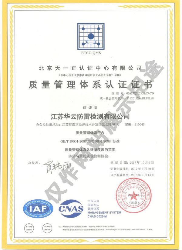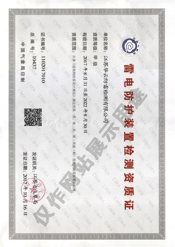 甲级防雷装置检验资质,在太仓、昆山、常熟地区开展雷电防护工程设计施工和防雷检测服务